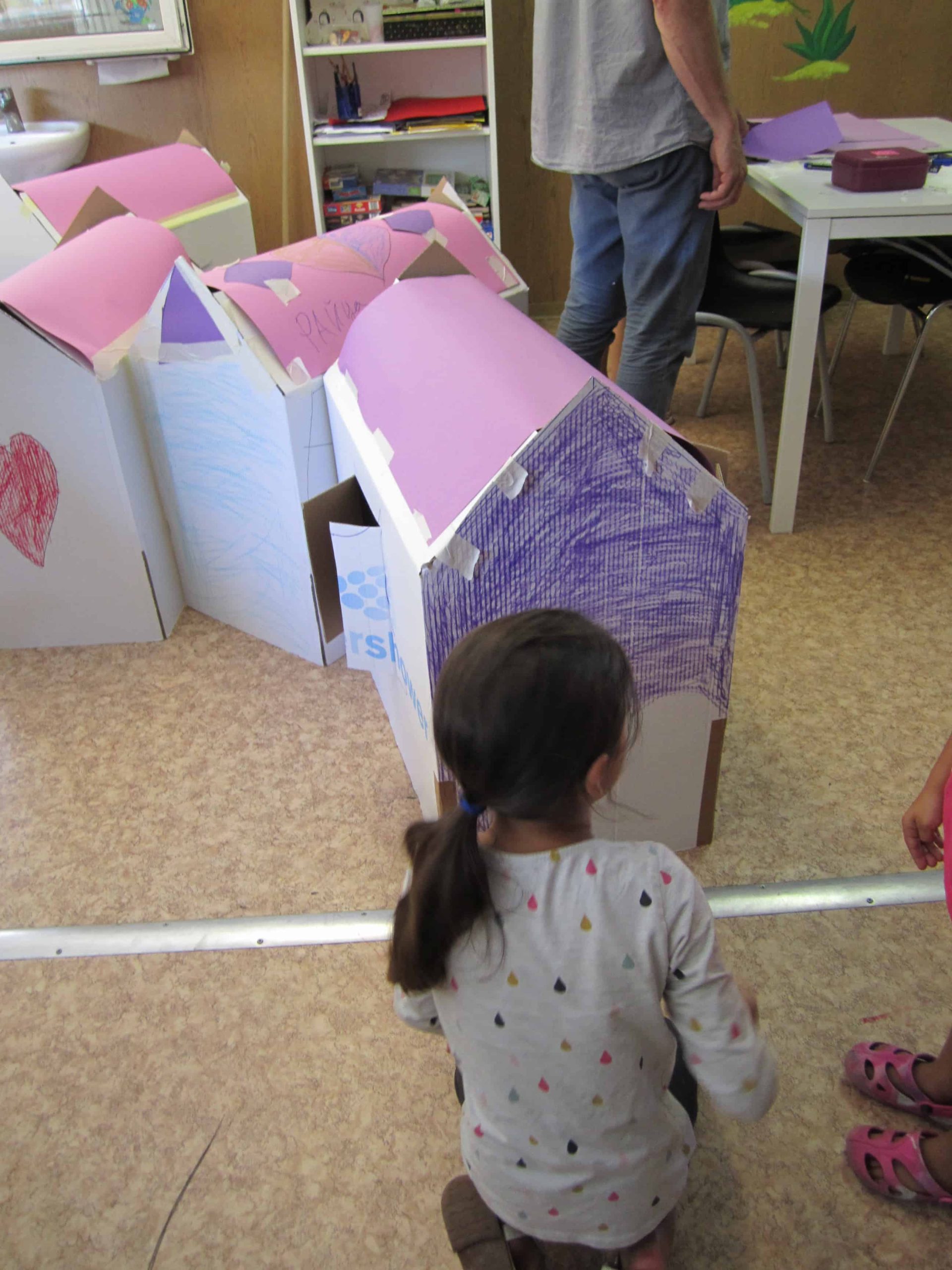 In der Kunsttherapie-Gruppe bot unsere Mitarbeiterin Maria Heller den Kindern einmal an, sich Häuser aus Pappkartons zu bauen: Die Kinder nahmen das Angebot sofort an, um sich einen eigenen Schutzraum zu schaffen. Konzentriert und mit Eifer bastelte sich jedes Kind das Abbild eines eigenen Zuhauses, weil es sich Geborgenheit wünscht.